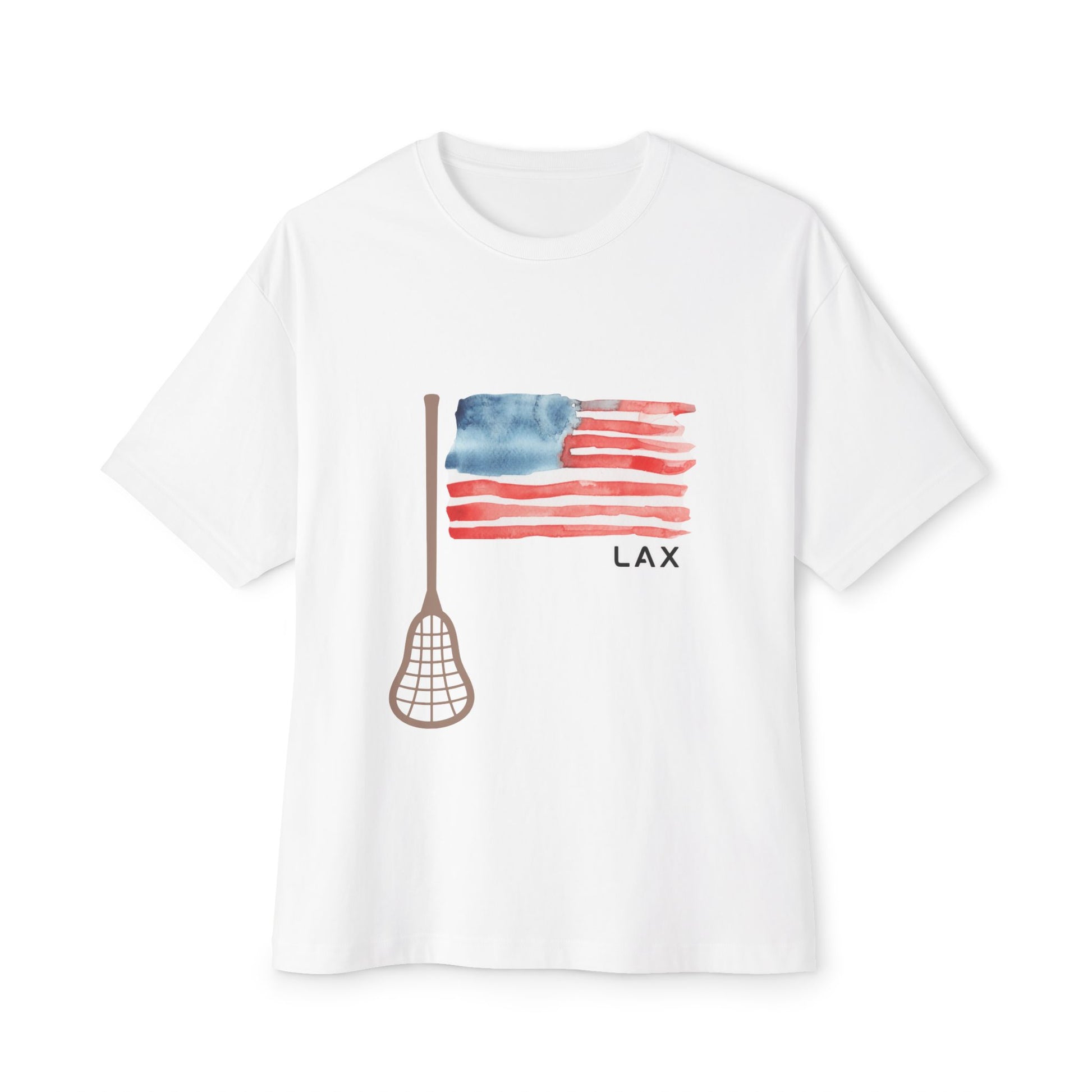 Lightweight, relaxed, and quietly patriotic — this boxy tee brings lacrosse season into everyday wear. The soft watercolor flag and delicate lacrosse stick sit low on the chest, giving the shirt an understated, artisanal feel. It hangs loose over jeans or shorts, sleeves dropped for an easy silhouette that moves with you. Wear it to weekend pick‑ups, post‑practice coffee runs, or while cheering from the sideline; the breathable cotton keeps you comfortable while the hand-painted look says you care about the game and the craft behind the design.